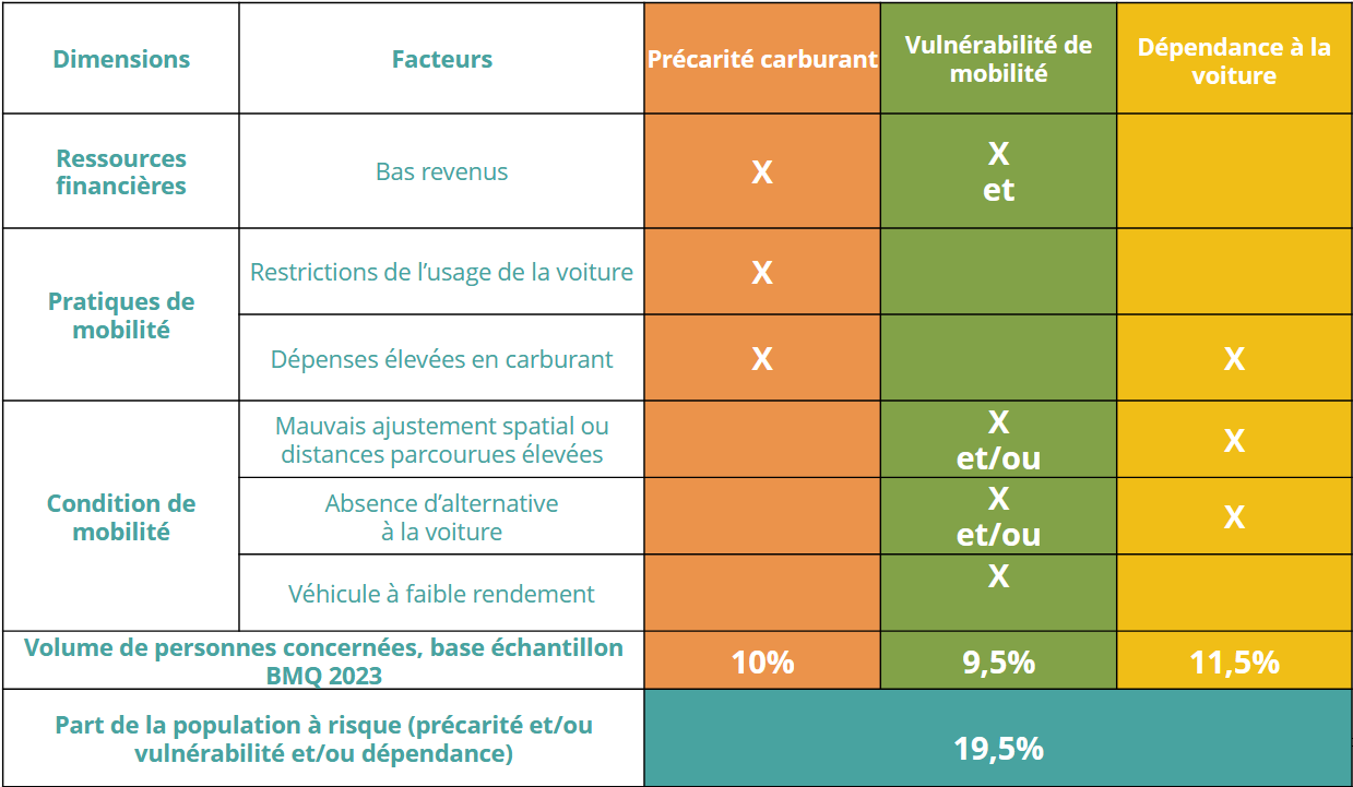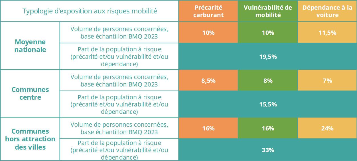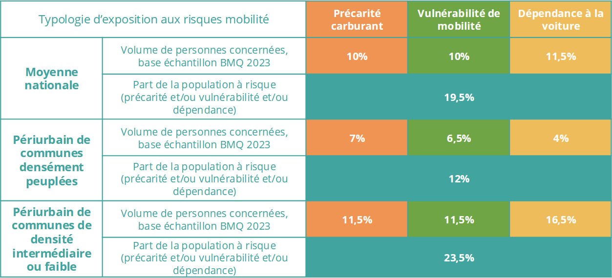 Environ 20% de la population française à risque avec une variabilité selon les typologies de territoires de 12 à 33% en considérant trois facteurs clé : la précarité façe aux dépenses de carburant, la vulnérabilité à la mobilité (des conditions de mobilité contraignantes : longue distance à parcourir, véhicules vieillissants…) et la dépendances à la voiture (absence de solutions alternatives)