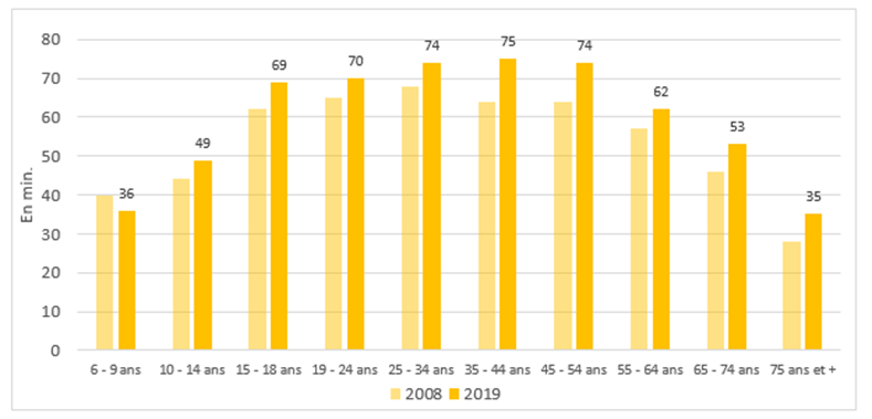 Evolution du budget temps quotidien par classe d’âge, entre 2008 et 2019. Champ : Individus de 6 ans ou plus résidant en France métropolitaine.